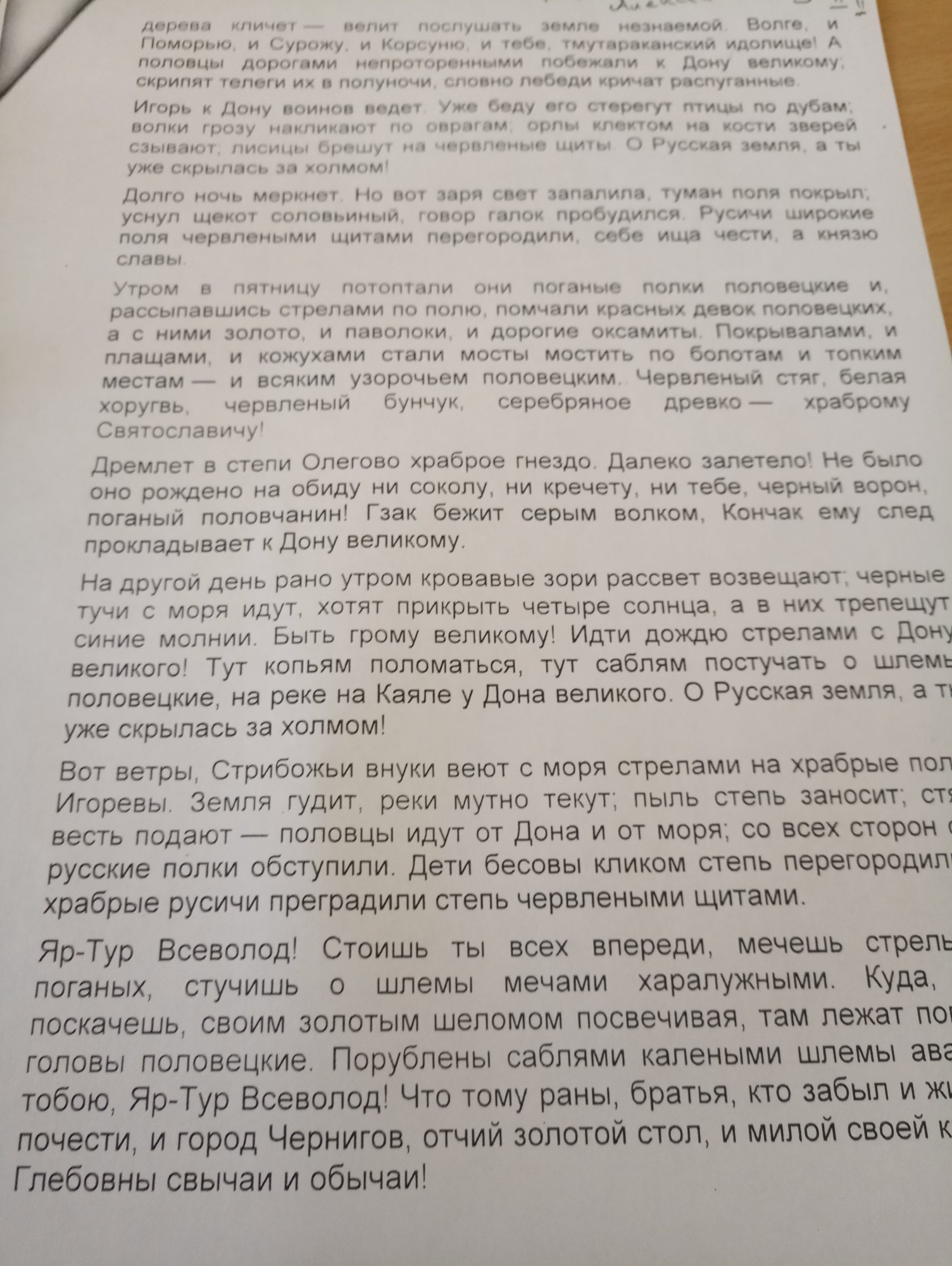 Эпитеты: тмутараканский идолище; поганые полки, Олегово храброе гнездо; золотым шеломом, мечами харалужными, саблями калеными