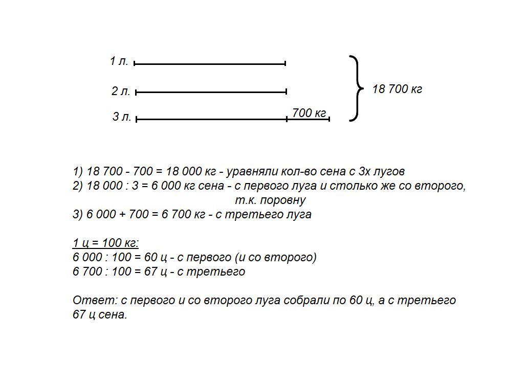 С трёх лугов собрали 18700 кг сена.С первого и со второго собрали сена поровну,а с третьего - на 700 кг больше, чем со второго.Сколько центнеров сена собрали с каждого луга? напишите пожалуйста краткую запись, решение и ответ.Заранее спасибо (задача 4 класс)