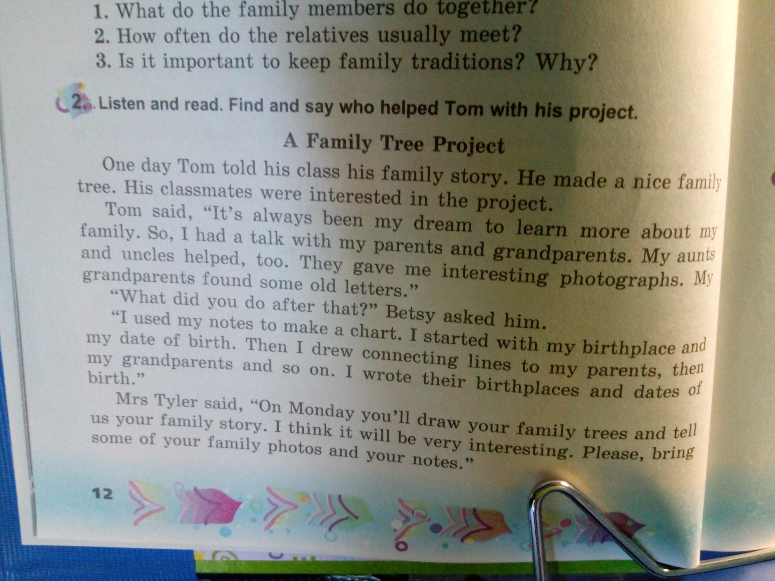 В один день Том рассказал его классу его семейную историю . Он сделал хорошее семейное древо. Его одноклассники были заинтересованны его проектом.