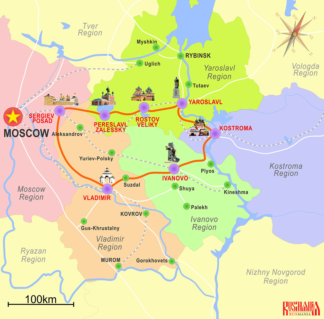 Golden Ring is a popular loop of pretty historical cities and towns forming a ring around Moscow. They are close enough to each other that most could be reached from any other in 24 hours. Their architecture and traditional crafts make them popular for tourism.