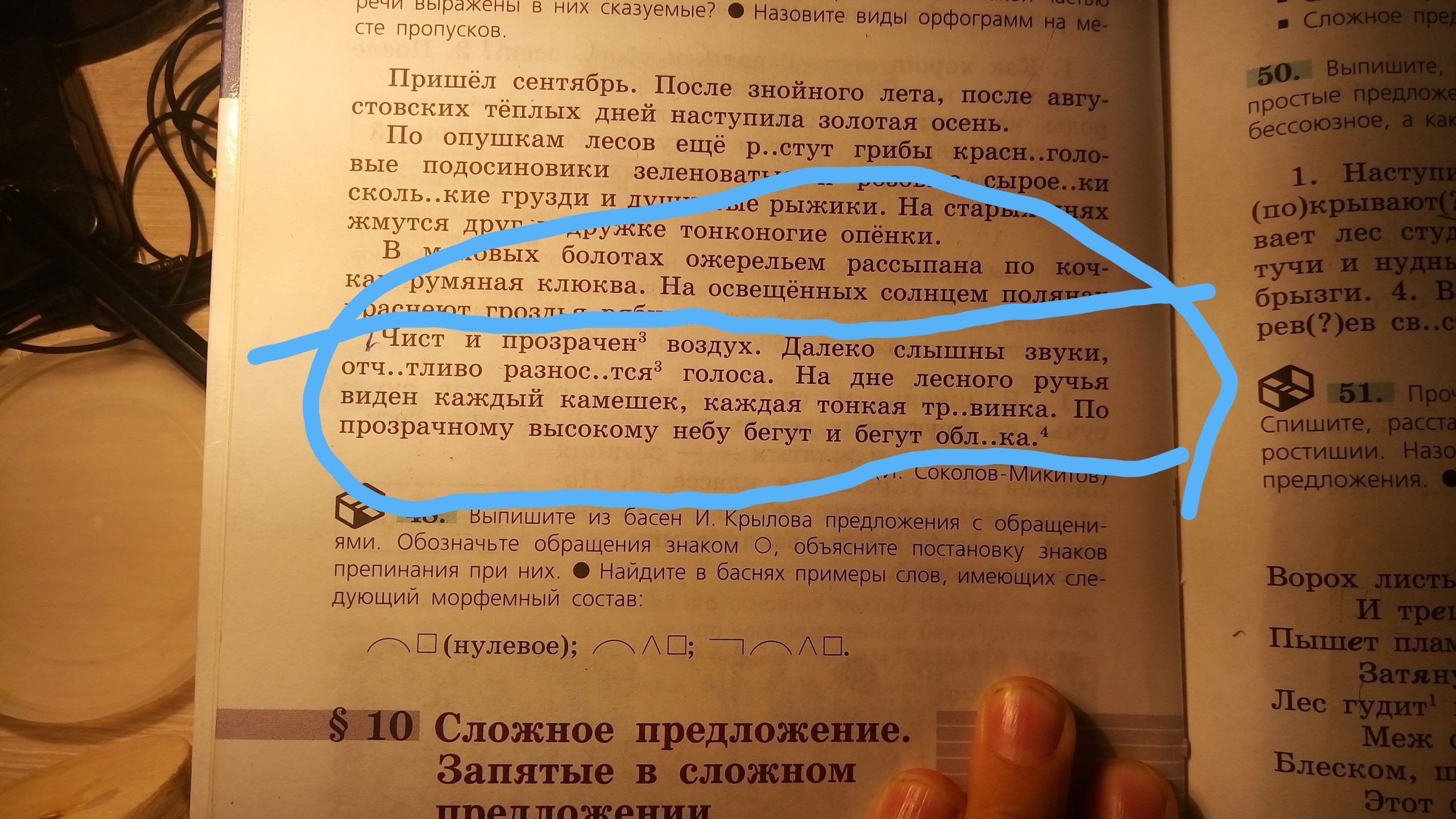 Прозрачному-опр, высокому-опр, небу-доп, бегут-сказ, облака-подл.