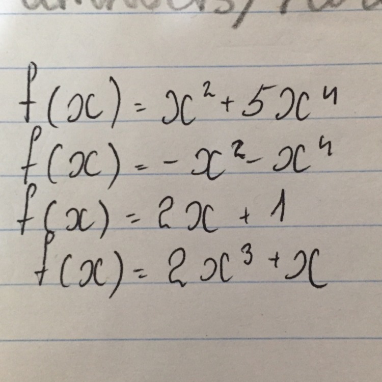 - f(-x)=(-x)²+5(-x)^4=x²+5x^4,f(-x)=f(x),x∈R,f(x)-четная по определению четной фунции