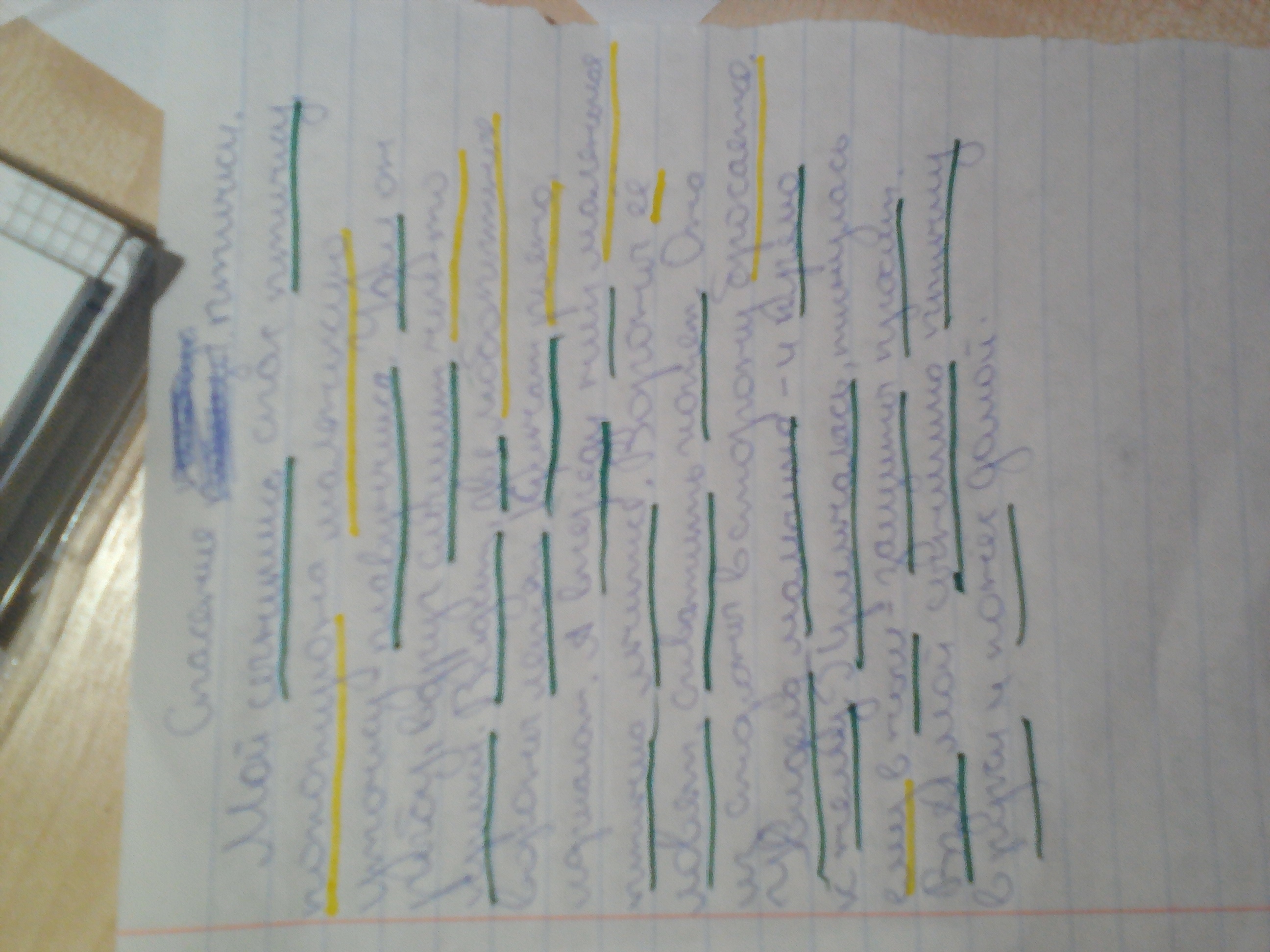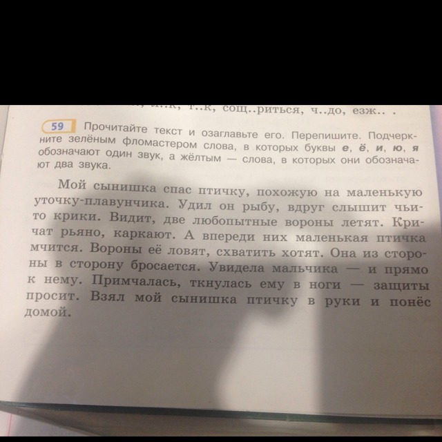 Прочитайте текст и озаглвьте его. Перепишите. Подчеркните зелёным фломастером слова,в которых буквы е,ё,и,ю,я обозначают один звук , а желтым -слова , в которых они обозначают два звука