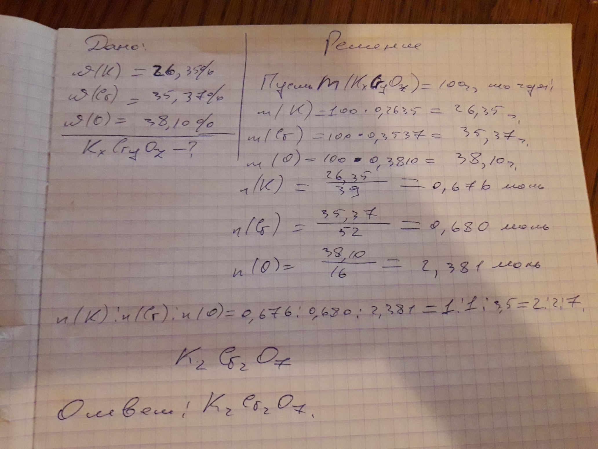 Речовина містить по (масі) 26,35% Калію, 35,37% Хрому і 38,10% Оксигену. Знайти його просту формулу