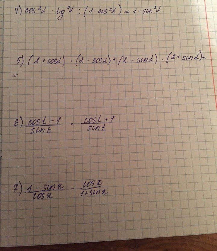 4) cos²a*tg²a:sin²a = 1 - sin²a