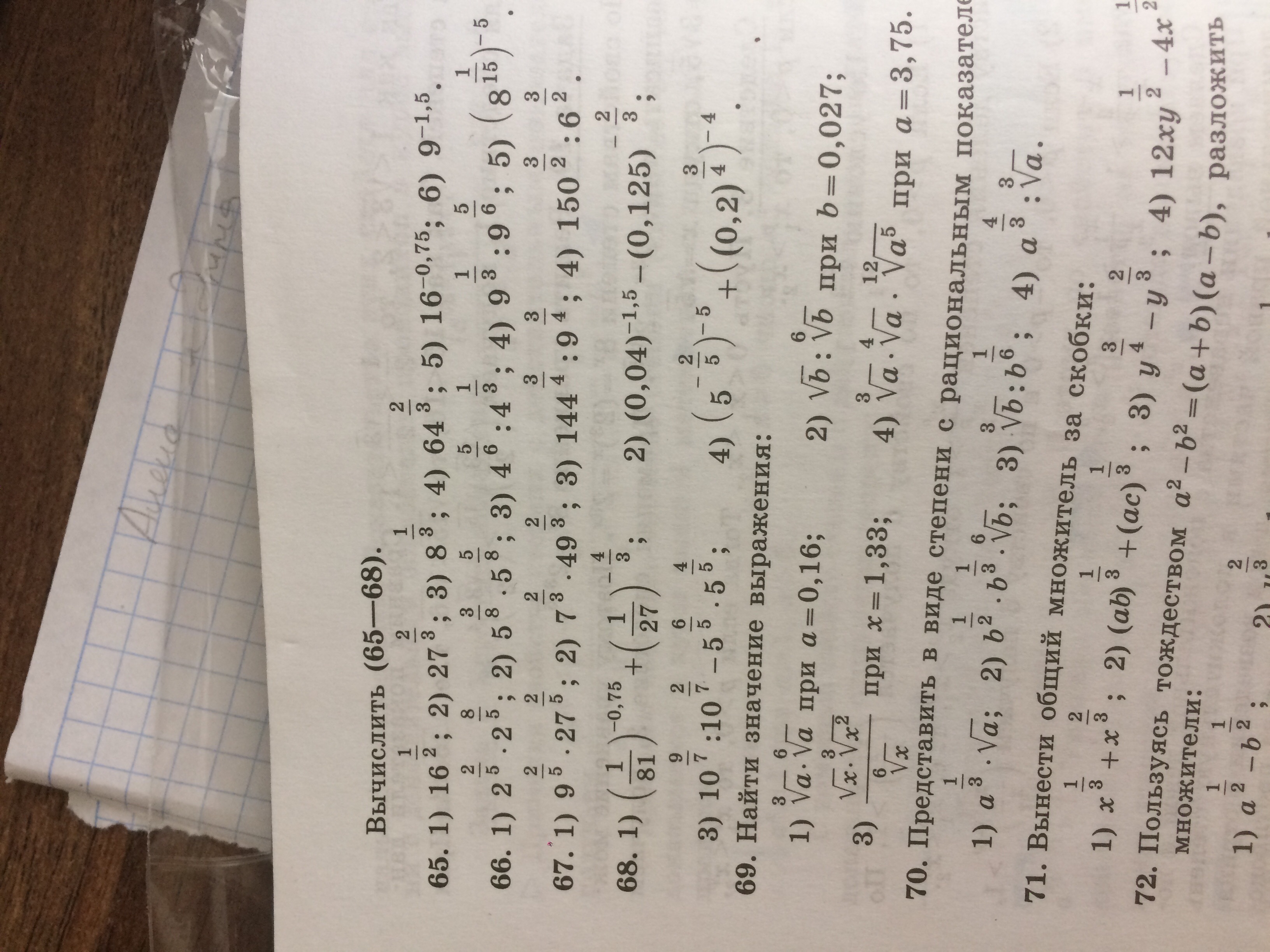 67. 1) 9^2/5 * 27^2/5 = (3^2)^2/5 * (3^3)^2/5 = (3^2*2/5) * (3^3*2/5) = 3^4/5 * 3^6/5 = 3^4/5+6/5 = 3^10/5 = 3^2 = 9
