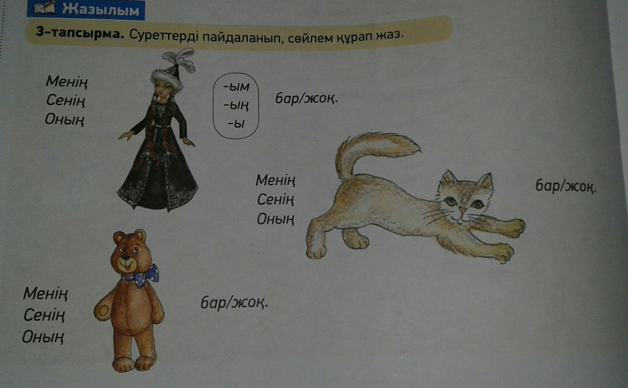 Менің қуыршағым бар.Сенің мысығың жоқ.Оның қонжығы бар.