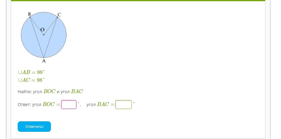 ∠ВОС=∪ВС=163° ∠ВАС=1/2∪ВС=163/2=81,5°