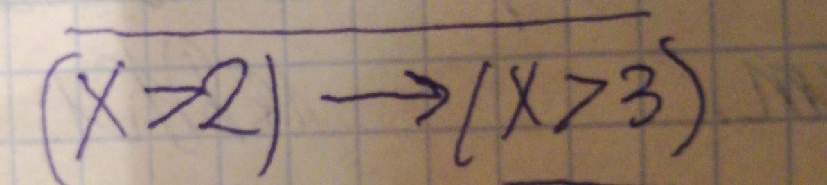 Высказывание не(A -> B) истинно в том случае, если A > B.(В данном случае A - (x > 2), B - (x > 3)