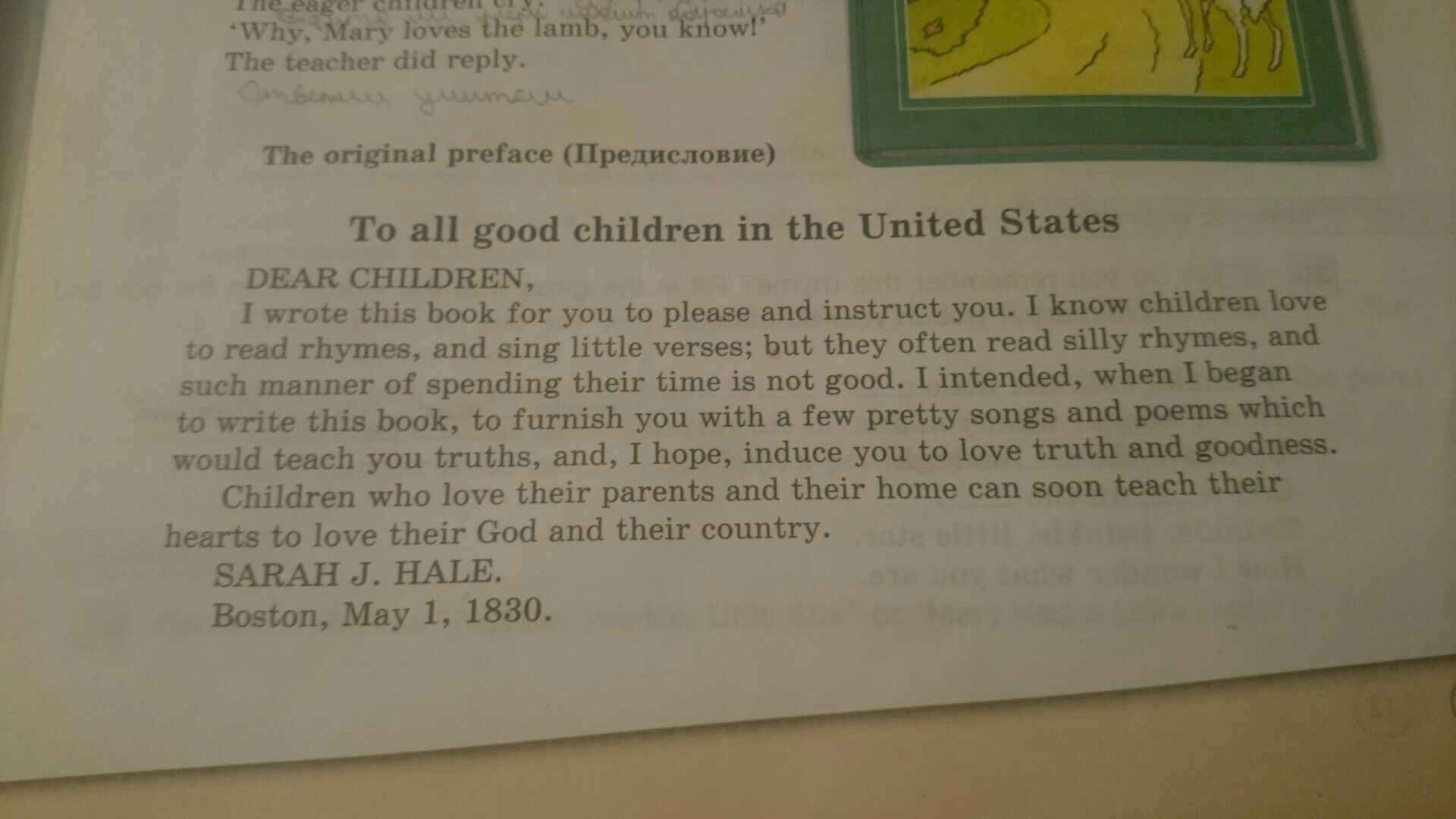 Для всех хороших детей в США ДОРОГИЕ ДЕТИ, я написал эту книгу для вас, чтобы угодить и проинструктировать вас. Я знаю, что дети любят читать рифмы и поют маленькие стихи; но они часто читают глупые рифмы, и такой способ тратить свое время не очень хорошо. Когда я начал писать эту книгу, я намеревался представить вам несколько хороших песен и стихов, которые научили бы вам истины и, надеюсь, побудили вас любить правду и добро. Дети, которые любят своих родителей и их дом, вскоре могут научить своих сердец любить своего Бога и свою страну. SARAH J. HALE Boston, 1 мая 1830 года.