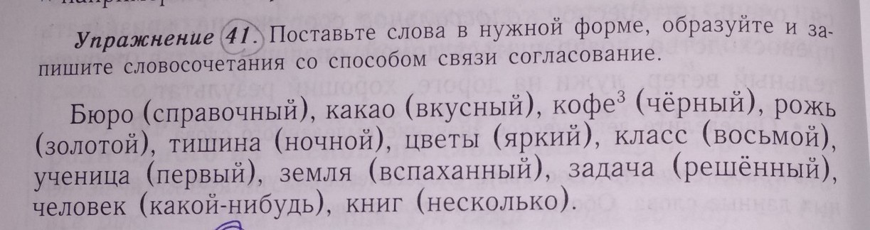 справочное бюро, вкусное какао, черный кофе, золотая рожь, ночная тишина, яркие цветы, восьмой класс, первая ученица, вспаханная земля, решенная задача, какой-нибудь человек, несколько книг.