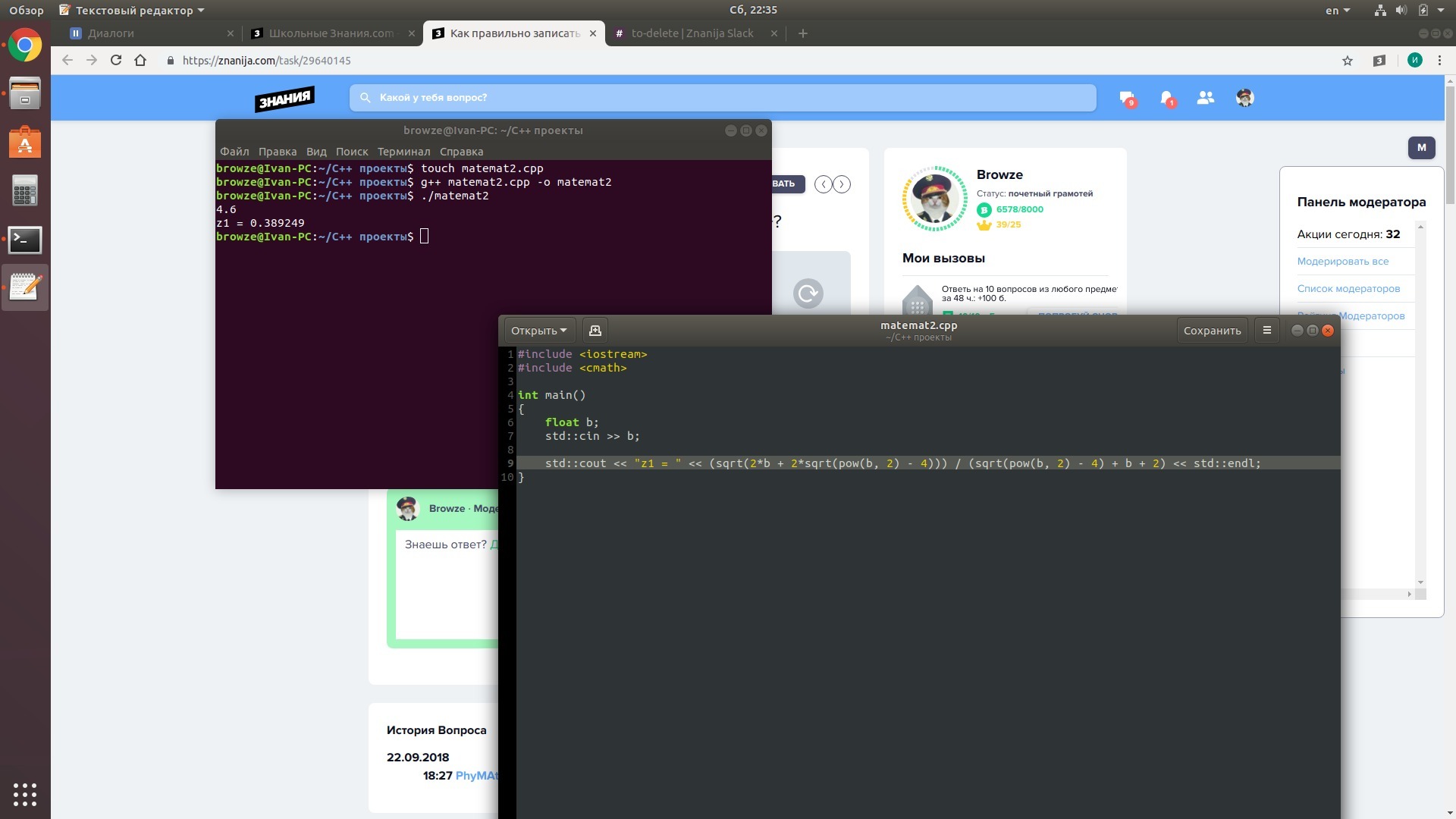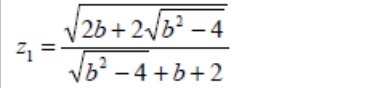 std::cout << "z1 = " << (sqrt(2*b + 2*sqrt(pow(b, 2) - 4))) / (sqrt(pow(b, 2) - 4) + b + 2) << std::endl;
