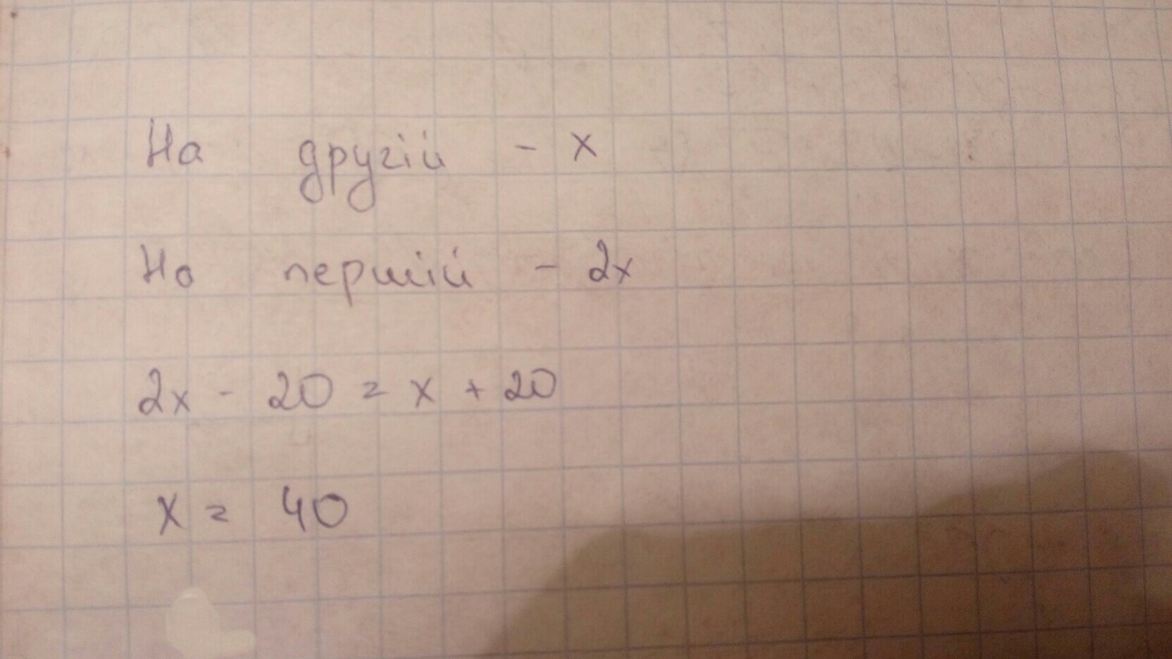 На першій полиці було в 2 рази більше книг,ніж на другій. Якщо з першої полиці переставити на другу 20 книг,то книг на обох полицях стане порівну.Скільки книг будо на другій поличці?