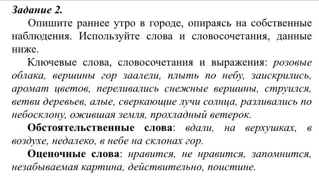Вот солнце ещё скрыто за горизонтом. Всё затихло, и только прохладный ветерок витал где-то в воздухе. Чувствовался аромат цветов, который струился неизвестно откуда, ведь зима была в самом разгаре. За несколько минут до восхода появились розовые облака, предвещающие появление светила. Вот заалели вершины гор. Значит, солнце вот-вот взойдёт и начнёт плыть по небу. И действительно, сверкающие лучи солнца внезапно вспыхнули вдали, и сразу же заискрились горные вершины. Утренние алые краски разливались по небосклону. Недалеко от моего окна ветви деревьев тоже вдруг приобрели этот неземной оттенок. На верхушках сосен и берёз проснулись птицы и запели, радуясь появлению солнца в небе. На склонах гор было много снега, поэтому снежные вершины переливались и блестели. Ожившая земля праздновала восход.