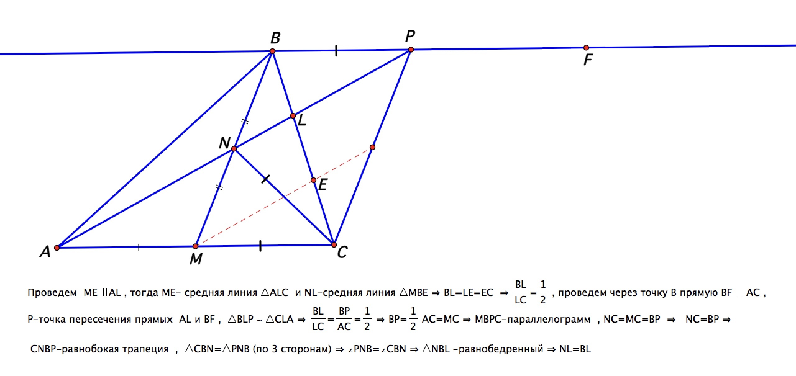 В треугольнике ABC проведена медиана BM. Точка N-середина отрезка BM,L -точка пересечения прямой AN и стороны BC. Известно, что CN=CM=AM.Докажите, что BL=NL.