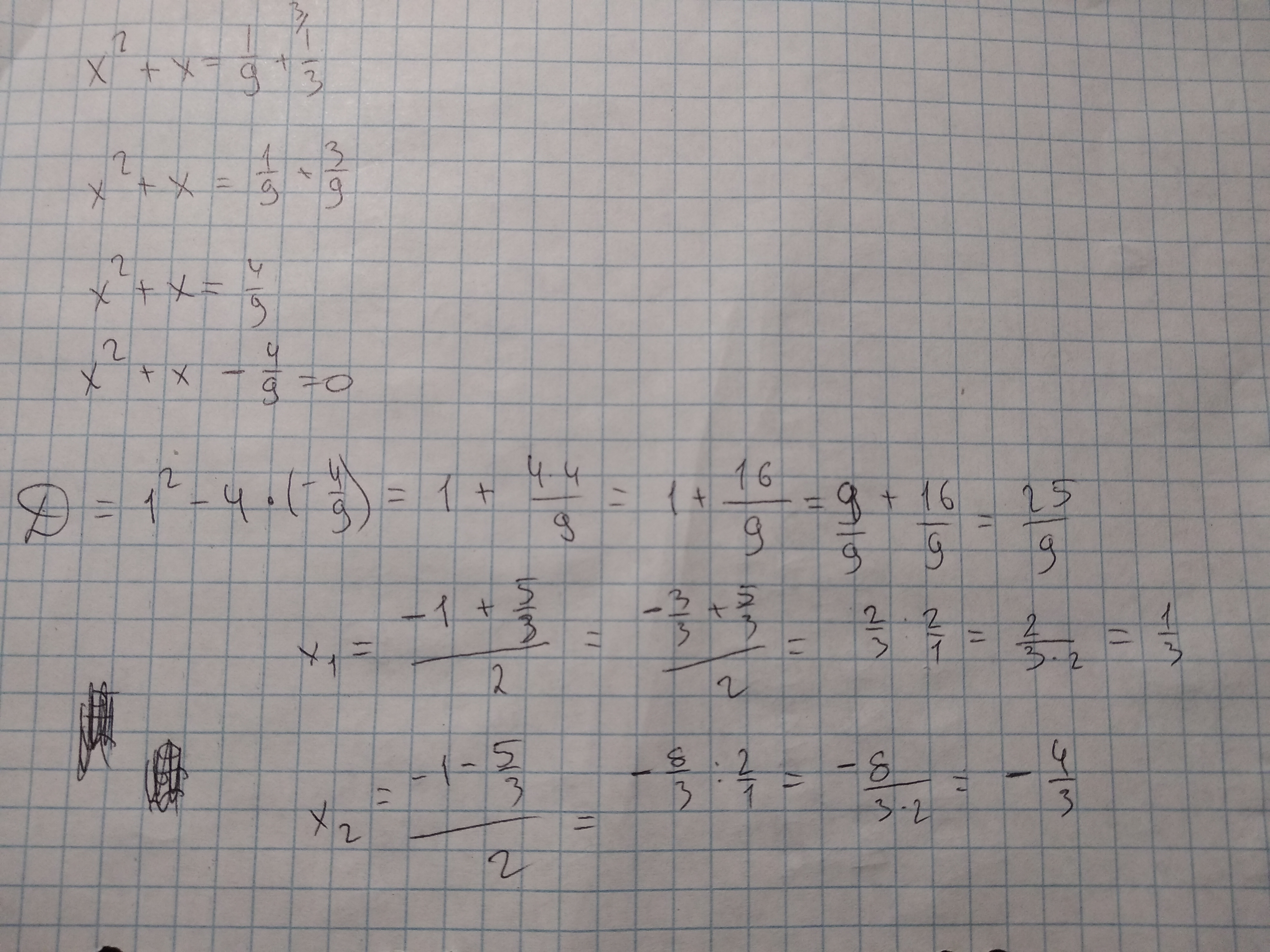 Решение квадратного уравнения, в начале считаем дроби и переносим всё в одну сторону, затем через дискриминант