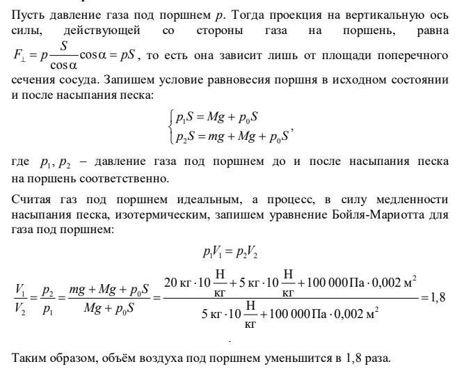 В сосуде под покоящемся поршнем,нижняя плоская поверхность которого составляет с горизонтом угол а(альфа)=30(градусов),находится воздух. Во сколько раз изменится объем воздуха под поршнем,если на него медленно насыпать песок массой м=20кг? Масса поршня равна М=5кг,площадь поперечного сечения сосуда S=20см^2, атмосферное давление р0(нулевое)=10^5 Па. Считайте,что g=10 м/с^2 и трения нет.