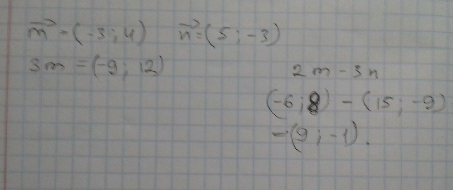 Даны векторы ->m=(-3, 4) и ->n=(5, -3). Вычислите скалярное произведение векторов 3->m и 2->m-3->n