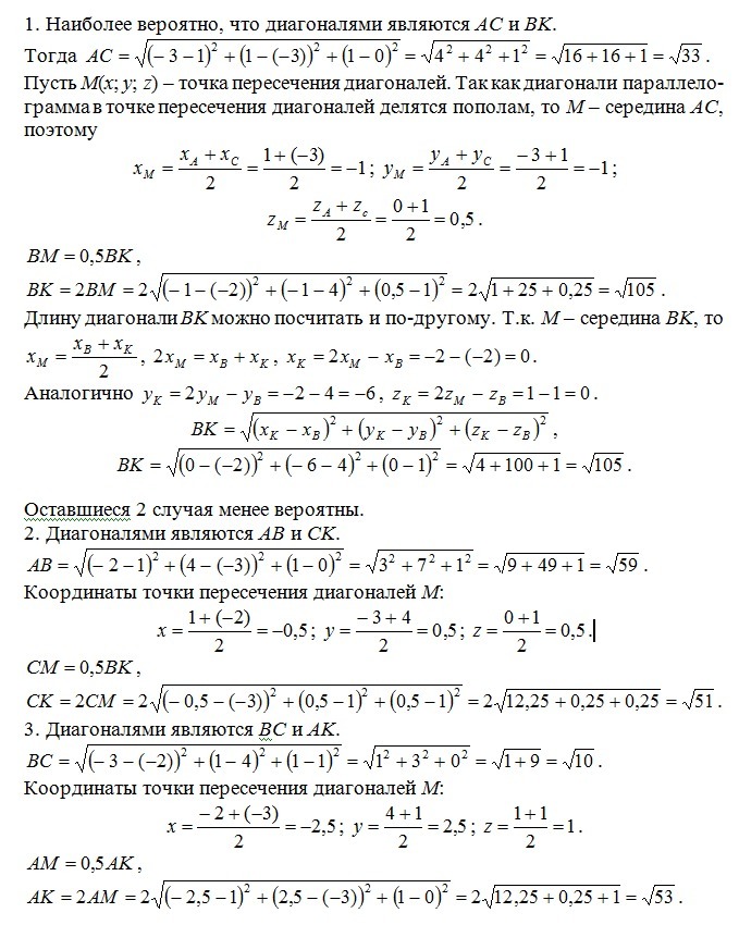 Вычислите длины диагоналей параллелограмма ABCK, если известны координаты его вершин A(1; -3; 0), B(-2; 4; 1), C(-3; 1; 1).