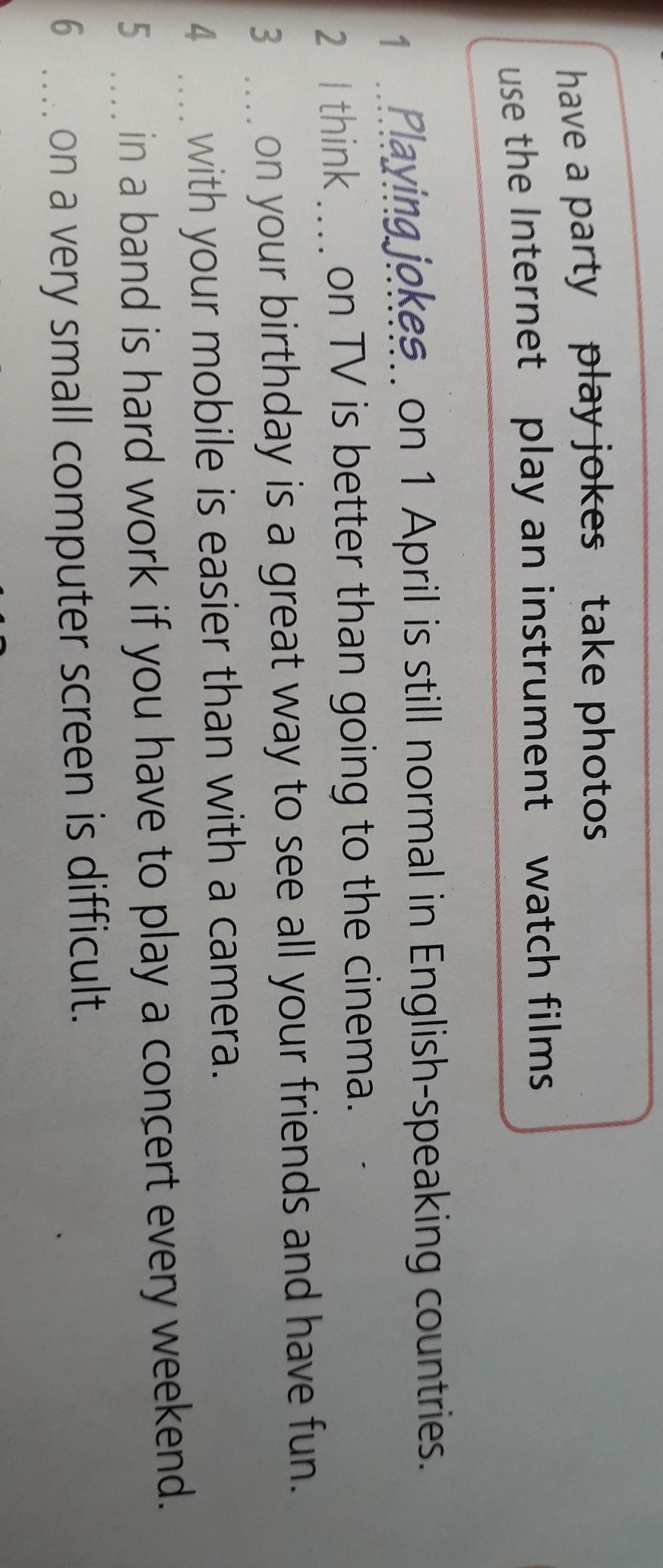 2. watching films. 3. have a party. 4. take a photos. 5. playing an instrument. 6. use the internet