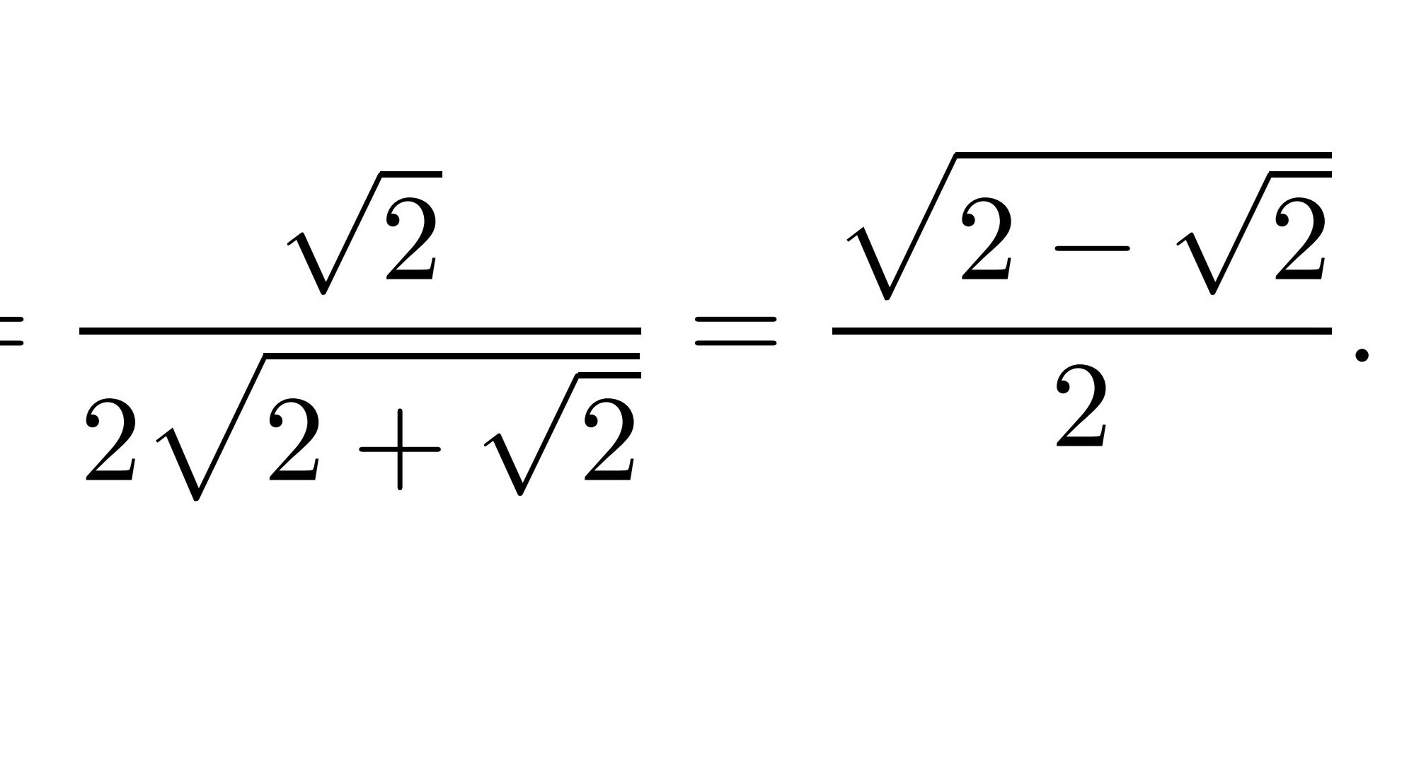 √2/(2√(2+√2))=√2(√(2-√2))/(2√((2+√2)(2-√2)))=√2(√(2-√2))/(2√(4-2))=√2(√(2-√2))/(2√2)=(√(2-√2))/2, что и требовалось доказать