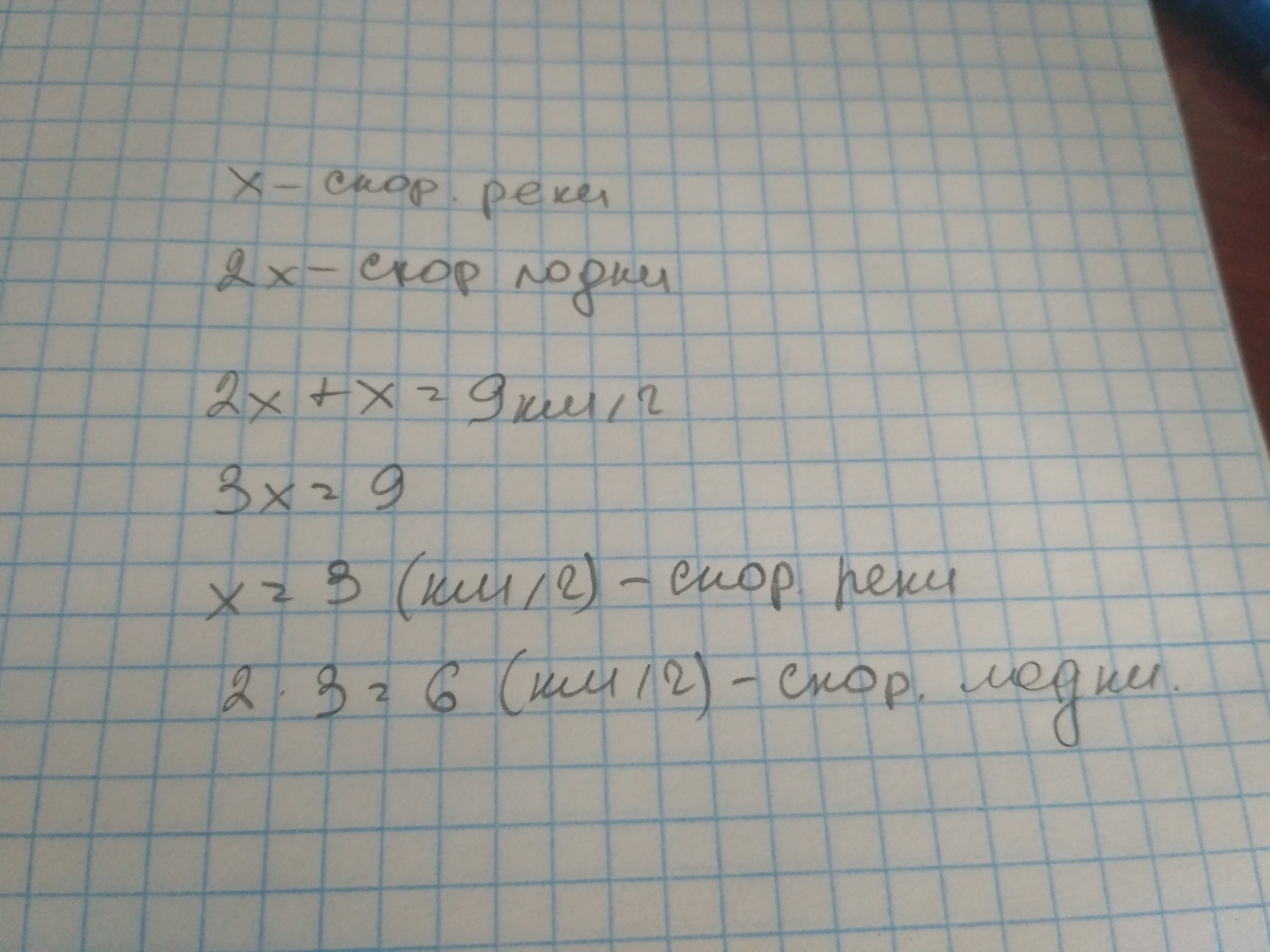 скорость лодки в 2 раза больше скорости течения реки. Найдите скорость лодки,если ее скорость по течению равна 9км/ ч