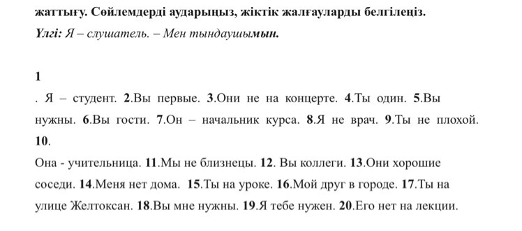 1. Мен студентпін. 2. Сіз біріншісіз. 3. Олал концертте емес. 4. Сен жалғызсың. 5. Сіз керексіз. 6. Сіз қонақтарсыз. 7. Ол кустрың бастығы. 8. Мен дәрігер емеспін. 9. Сен жаман емессің. 10. Ол муғалім. 11. Біз егіз емеспіз. 12. Сіздер әріптестерсіз. 13. Олар жақсы көршілер. 14. Мен үйде емеспін. 15. Сен сабақтасың. 16. Менің досым қалада. 17. Сен Желтоқсан көшесіндесің. 18. Сіз маған керексіз. 19. Мен саған керекпін. 20. Ол сабақта жоқ.