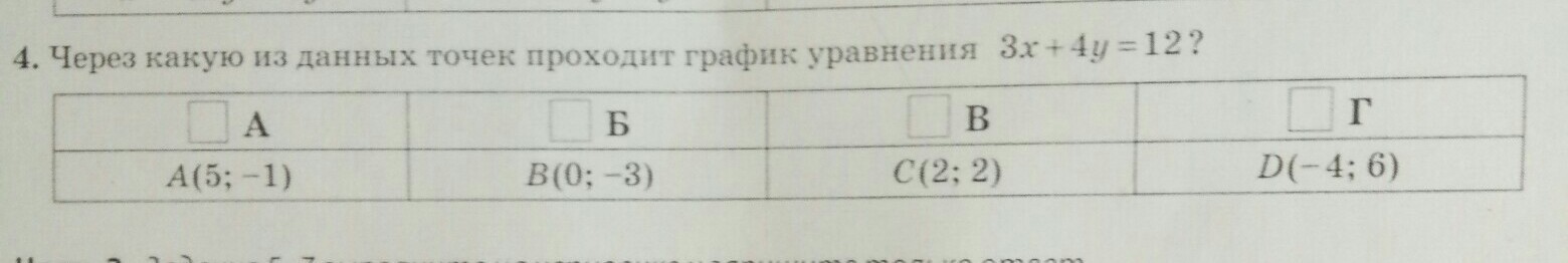 Координаты точки D удовлетворяют уравнению, значит эта точка лежит на графике уравнения 3х+4у=12. Остальные точки не лежат на графике уравнения ( я проверила устно, ты можешь проверить это письменно).