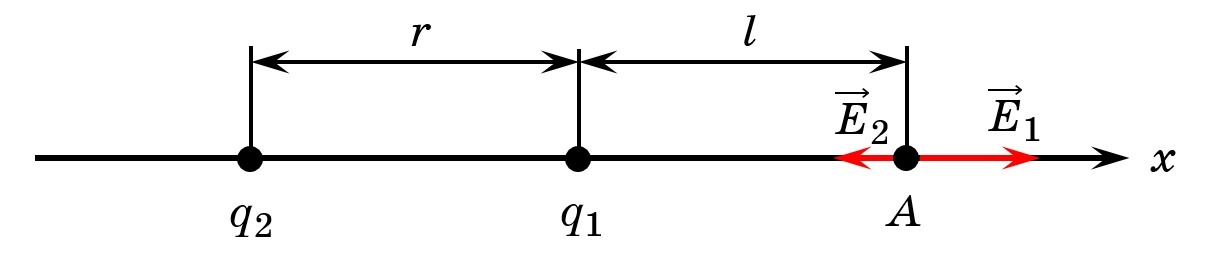 Расстояние между двумя точечными зарядами 4 нКл и -10 нКл равно 20 см. Определите направление и модуль напряжённости поля в точке, которая расположена на прямой, соединяющей эти заряды, на расстоянии 20 см от меньшего заряда за ним.