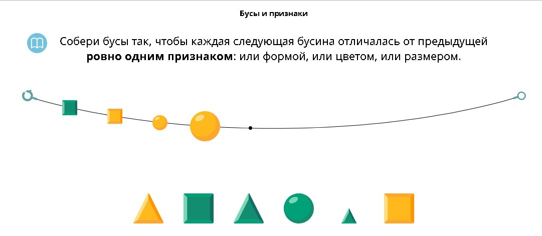 сначала маленький зеленый треугольник- большой зеленый треугольник(признак:размер), затем большой шар зеленый-большой квадрат зеленый(признак:форма), большой квадрат желтый-большой желтый треугольник(признак:форма).