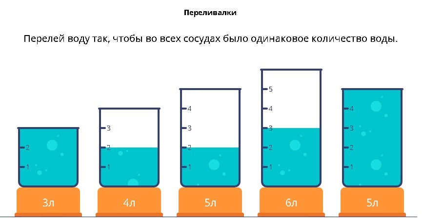 3. С 5 сосуда отлить по 1 литру во 2 и 3 сосуд. Итого в каждом сосуде будет по 3 литра.
