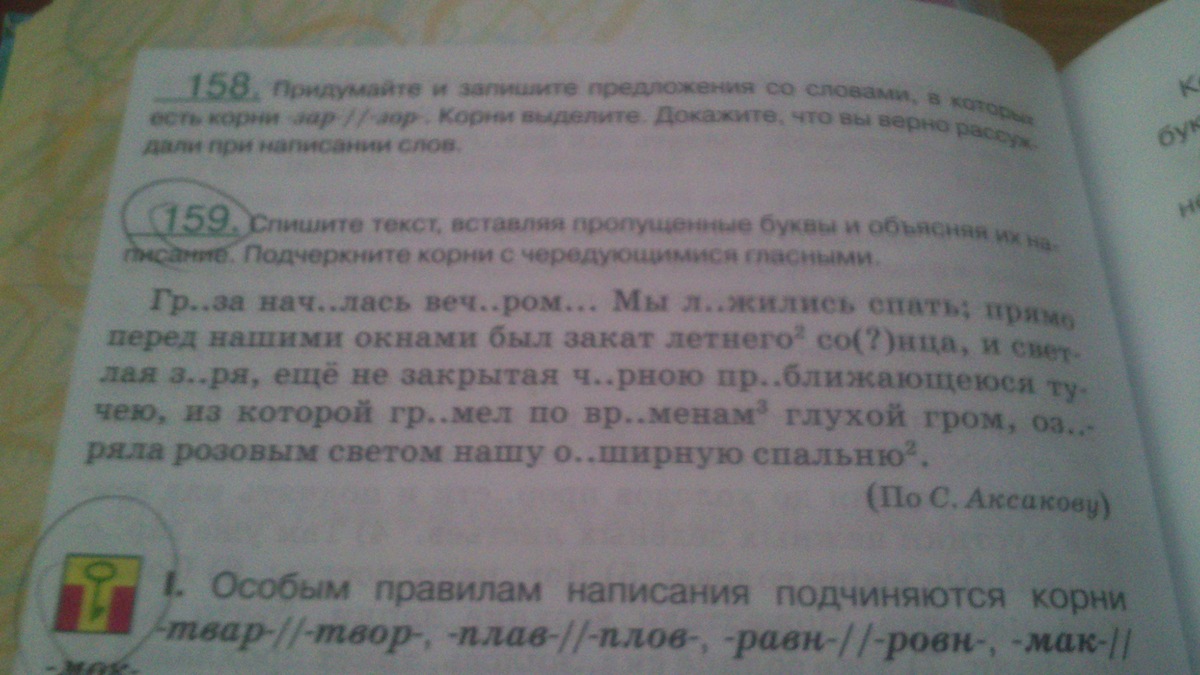 Гроз`а (гр`озы) началась (ча-ща пишется с а) в`ечером (веч`ерний)... Мы ложились (в корнях лож/лаг перед ж пишется о) спать: прямо перед нашими окнами был закат летнего солнца (непроизносимую л проверяют солнечный), и светлая зар`я (в корнях зор/зар без ударения пишется а), еще не закрытая чёрной (`ё после шипящих, ч`ернь) приближающейся (при ¬ означ. приближение) тучей, из которой гремел по времен`ам (вр`емя) глухой гром, озар`яла (в корнях зор/зар без ударения пишется а) розовым светом нашу обширную (об ¬) спальню.