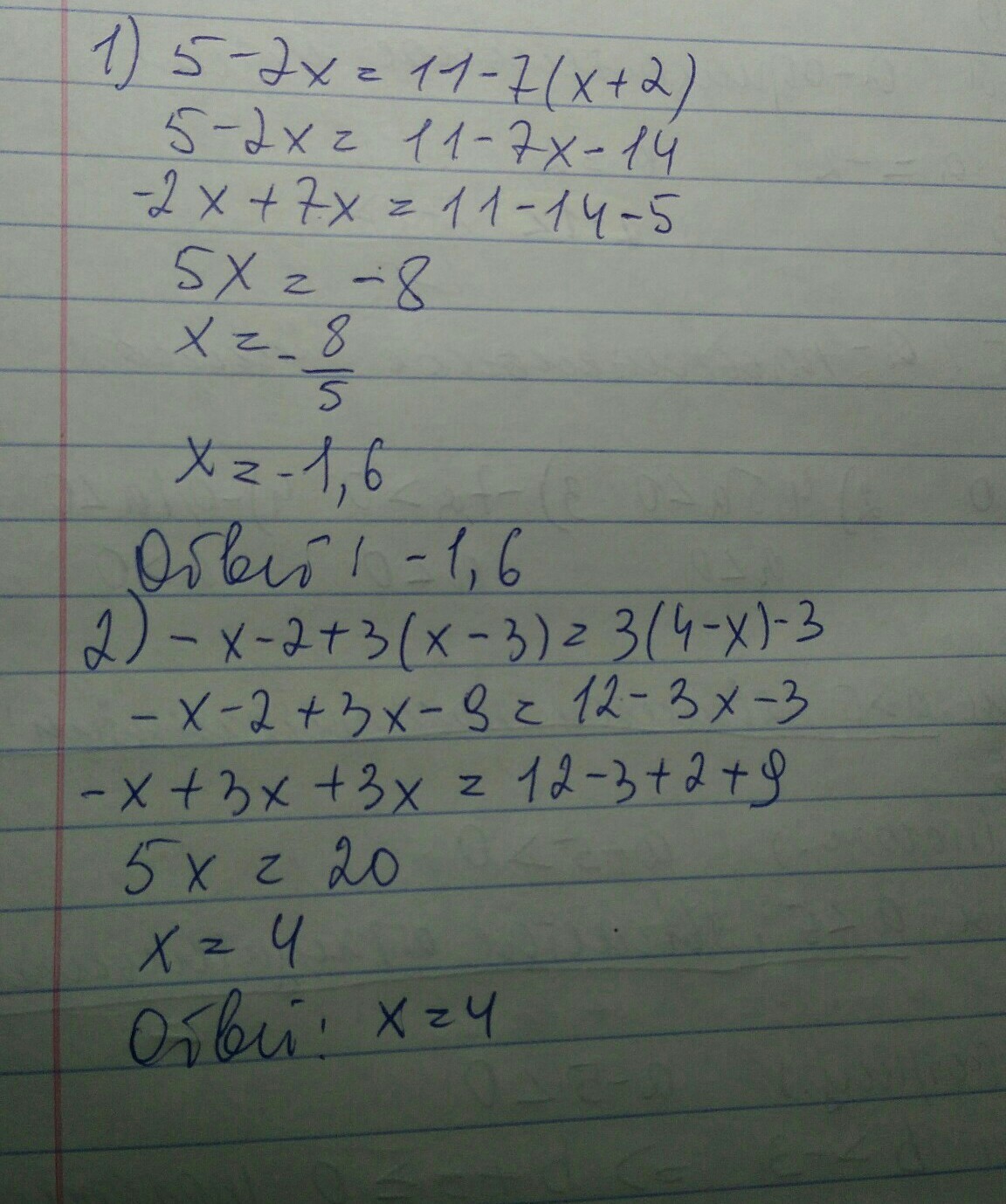 Ответ: 1) х=(-1,6); 2) х=4.