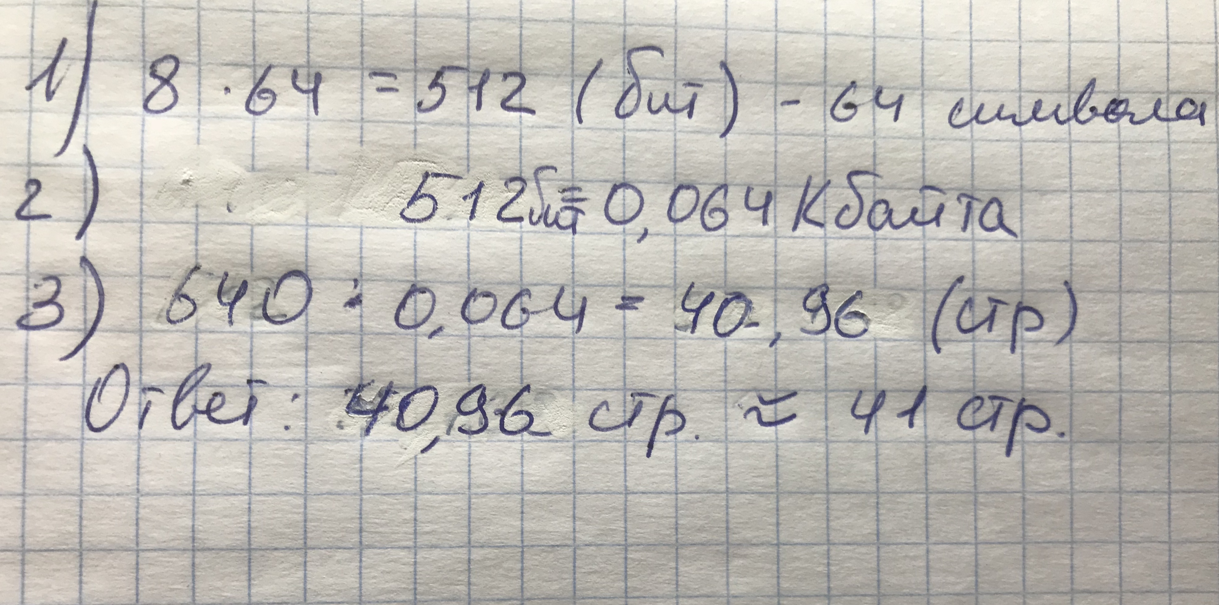 Какое количество страниц книги поместится в файле объемом 640 Кбайт, если каждая страница содержит по 64 символа, а 1 символ занимает 8 бит? Помогите пожалуйста!!!