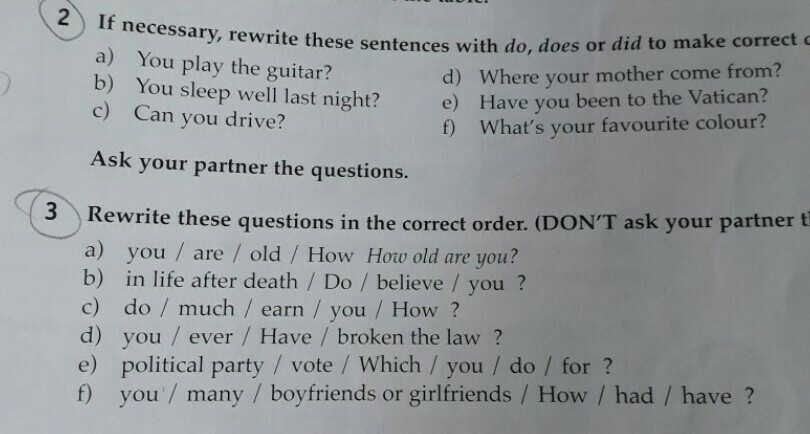 2. a) Do you play the guitar? b) Did you sleep well last night? c) - d) Where do/did your mother come from? e) - f) -