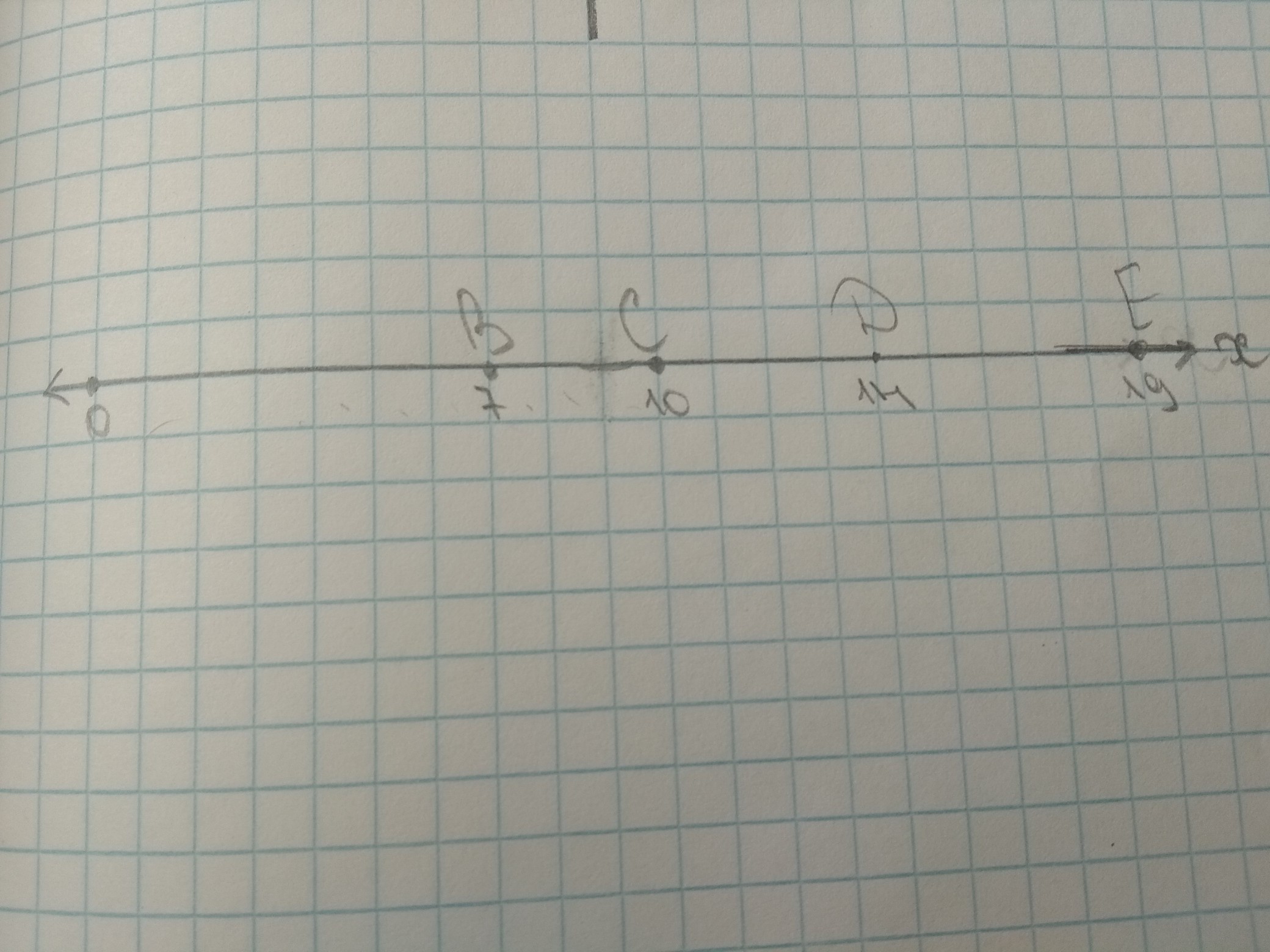 a) Начертите координатную прямую, приняв за единичный отрезок одну клеточку. Отметьте на ней точки В (7,) C (10) D (14) Е (19)
