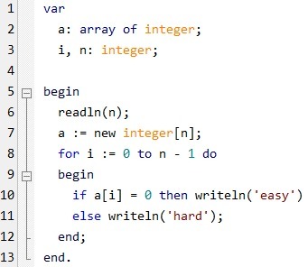 if a[i]=0 then writeln('easy')