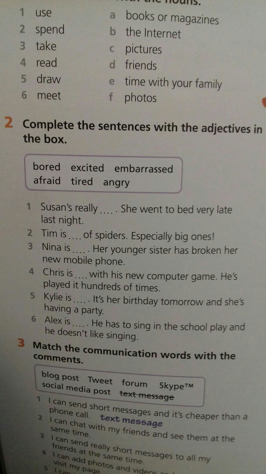 tired 2. afraid 3. angry 4. bored 5. excited 6. embarassed
