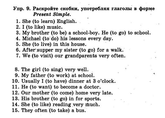 1. Learns; 2. Like; 3. Is/Goes; 4. Does; 5. Lives; 6. Goes; 7. Visit; 8. Sings; 9. Works; 10. Have; 11. Wants; 12. Comes; 13. Goes; 14. Likes; 15. Take.
