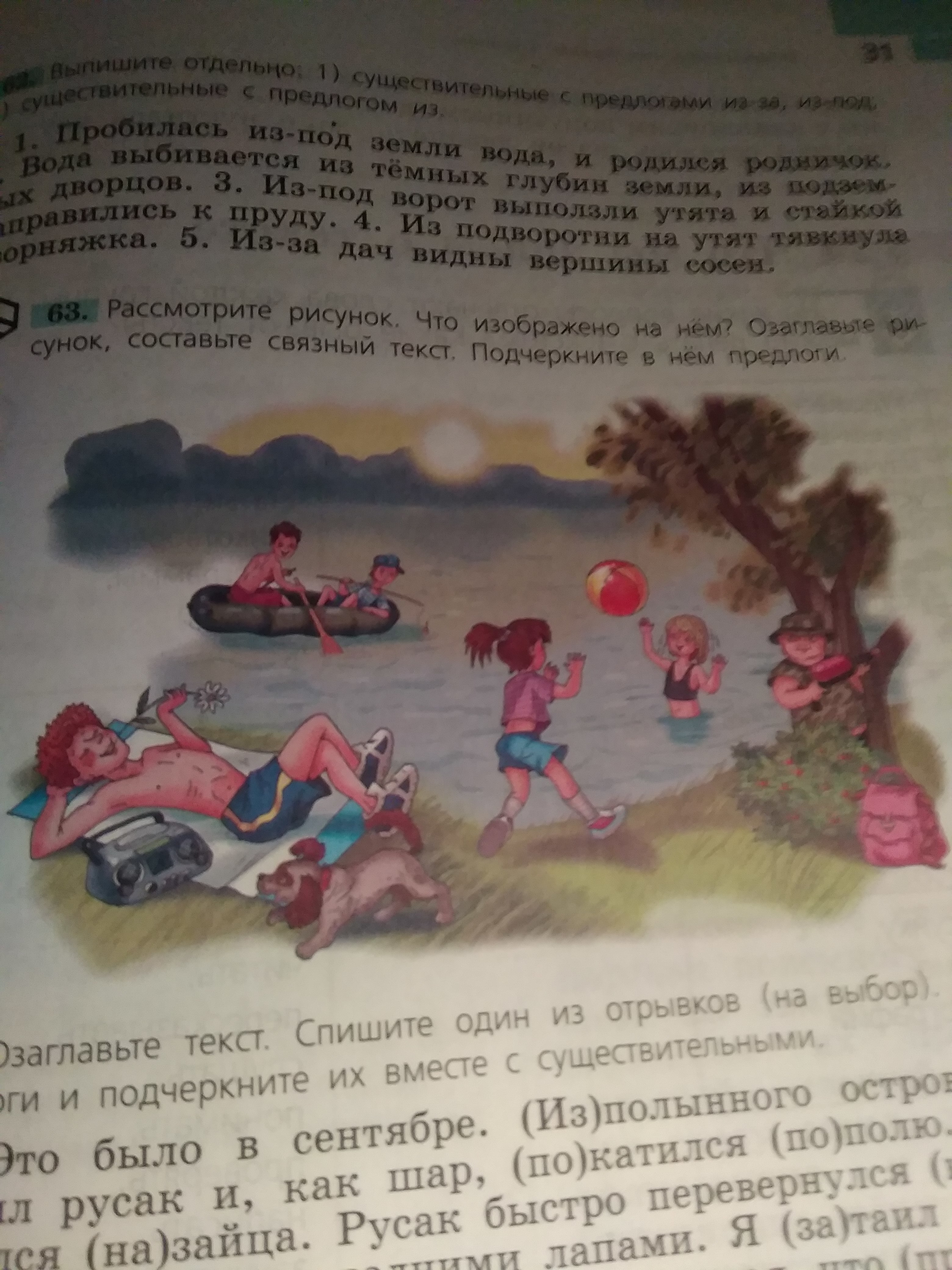 Было лето. Девочки играли с мячом. Одни мальчики рыбачили,а другой загарал. Было жарко и весело.