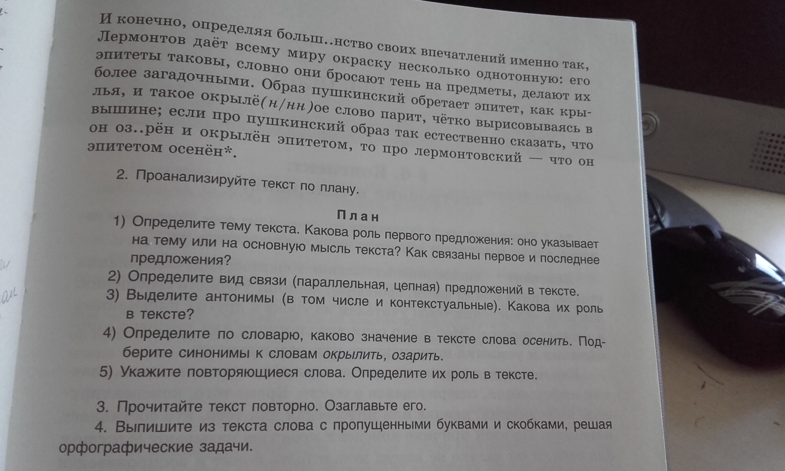 1. Тема текста: Различия поэтического мира Пушкина и Лермонтова в их эпитетах. Первое предложение, очевидно, является темой текста. Первое предложение явзяется тезисом, а второе - выводом к этому тезису (т.е. своеобразным объяснением и раскрытием тезиса).