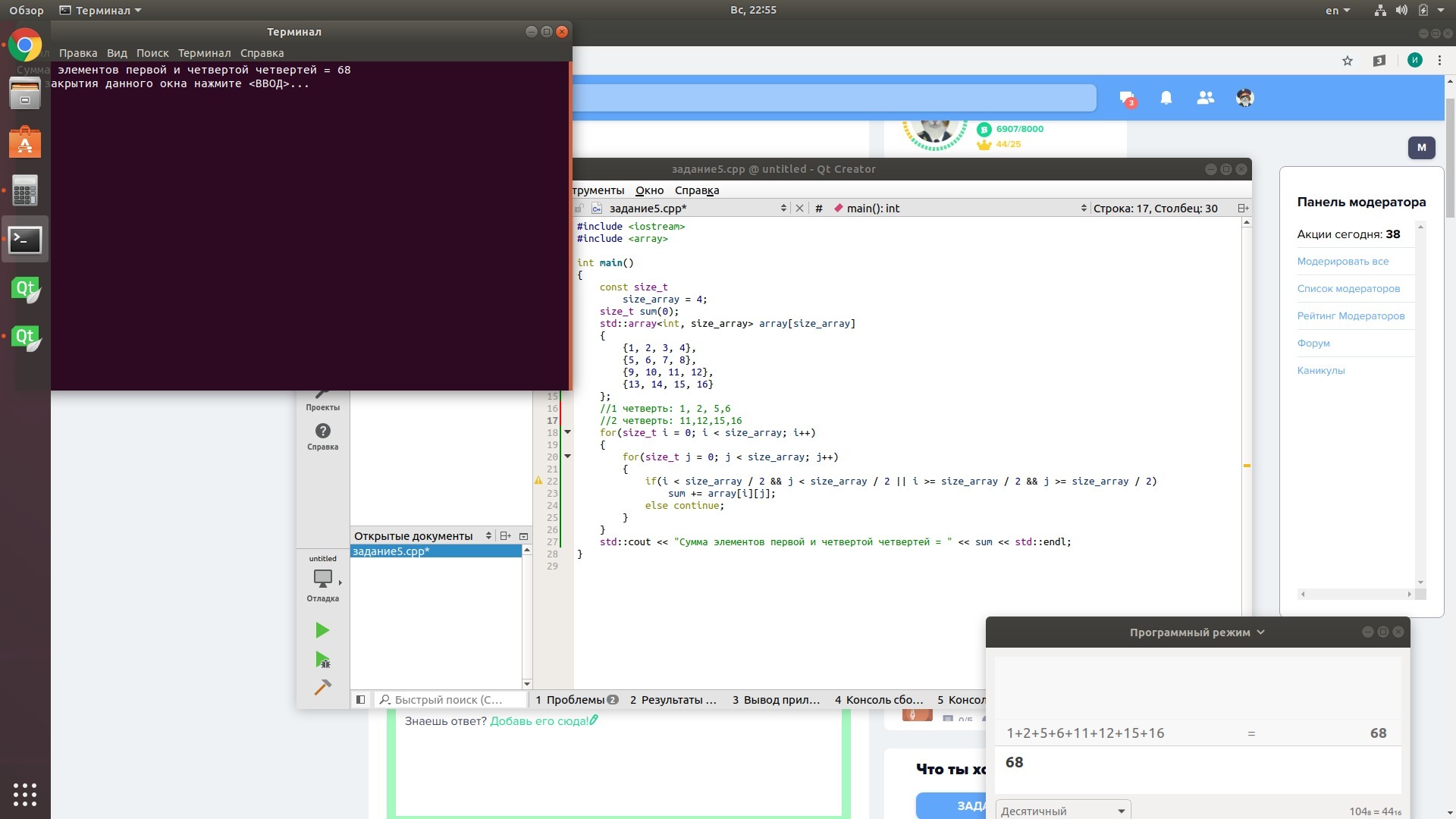 std::cout << "Сумма элементов первой и четвертой четвертей = " << sum << std::endl;