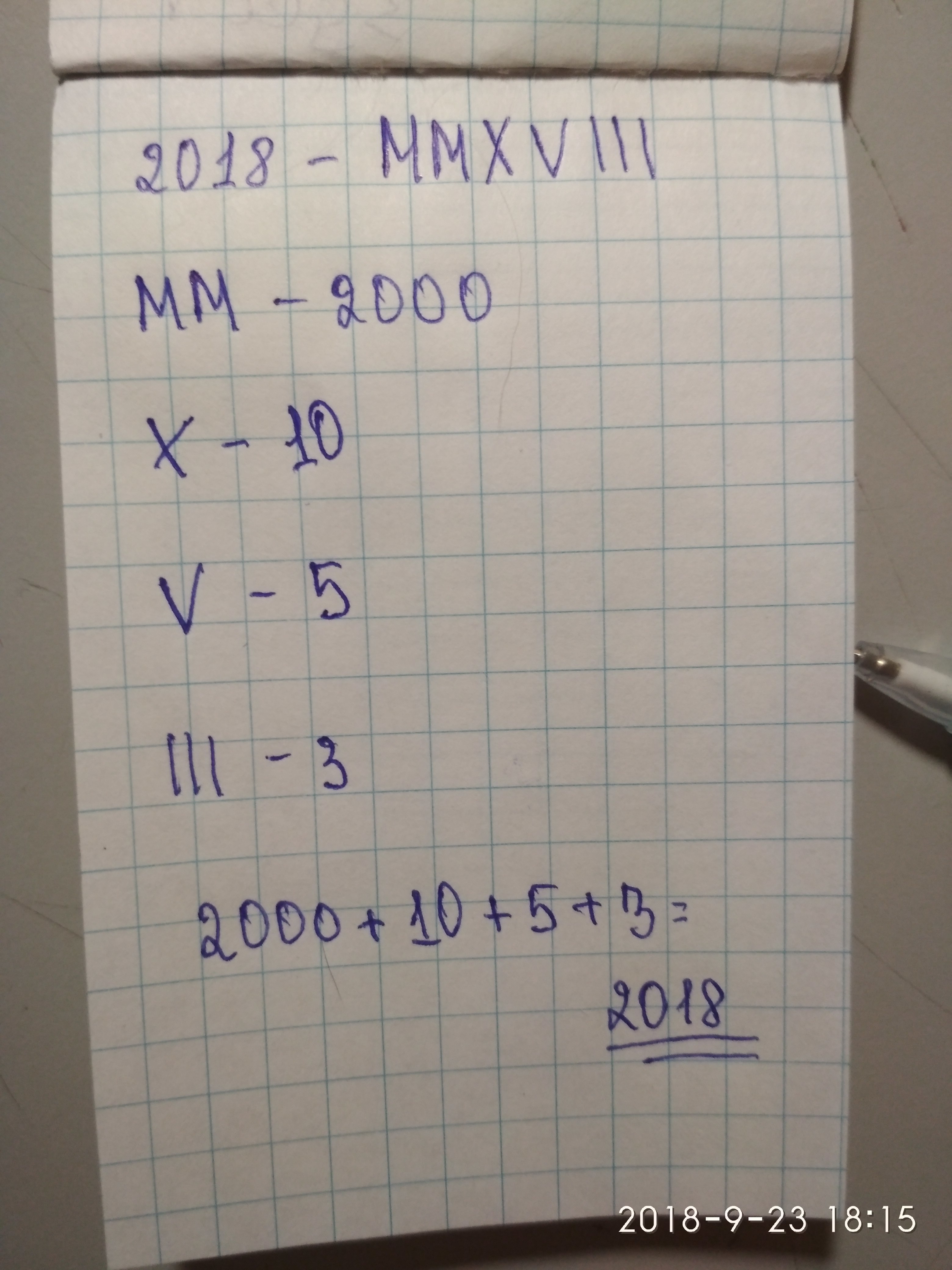 Ссори, V - 5.. и получается что MM - это 2000, а X - 10, V - 5 и III - 3.. вот теперь складываем/составляем это, и получаем 2018, то есть MMXVIII