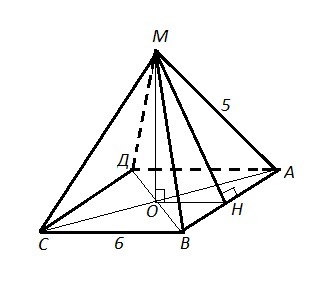 В правильной четырёхугольной пирамиде МАВСD сторона основания равна 6 см, а боковое ребро 5 см.