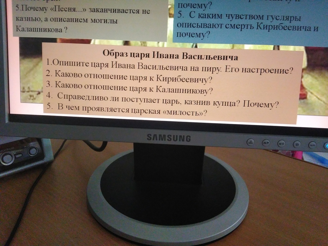 Версии, выдвигаемые царем, характеризуют образ жизни опричника: испортилось платье, не хватает денег, сабля затупилась, конь захромал, в кулачном бою проиграл. Вот и все беды, которые могут быть, с точки зрения царя, у Кирибеевича. Узнав об истинной причине грусти, царь вновь смеется, дает перстень яхонтовый и ожерелье жемчужное как дар любимой опричника. «Как полюбишься – празднуй свадебку, // Не полюбишься – не прогневайся».