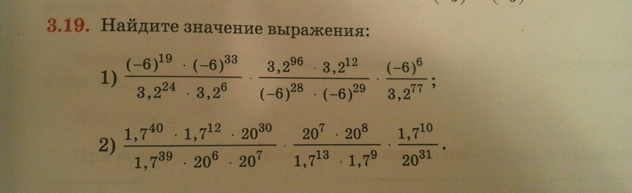 1. (-6)¹⁹*(-6)³³/((3,2)²⁴*(3,2)⁶)=(-6)⁽¹⁹⁺³³⁾/(3,2)⁽²⁴⁺⁶⁾=(-6)⁵²/(3,2)³⁰.