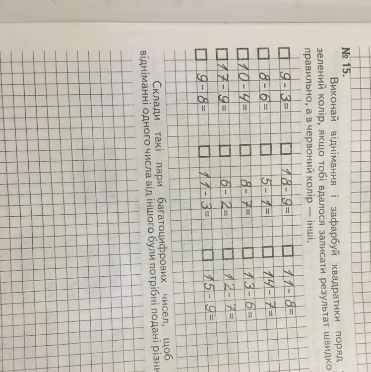 9-3=6 , 8-6=2 , 10-4=6 , 17-9=8 , 9-8=1 , 18-9=9 , 5-1=4 , 8-7=1 , 6-2=4 , 11-3=8 , 11-8=3 , 14-7=7 , 13-6=7 , 12-7=5 , 15-9=6.