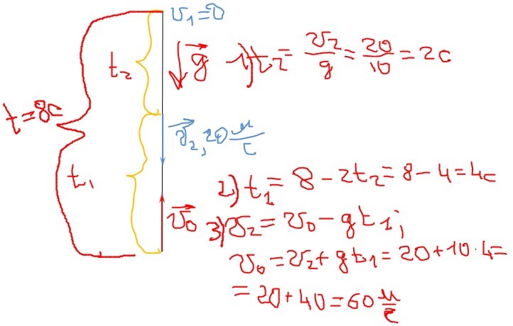 з якою початковою швидкістю слід кинути м'яч вертикально вгору, щоб через 8с він падав вниз із швидкістю 20м/с