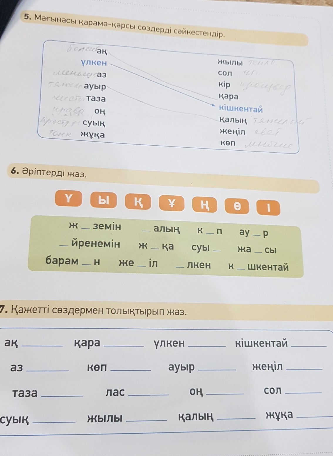 жүземін, қалың, көп, ауыр, үйренемін, жұқа, суық, жақсы, барамын, жеңіл, үлкен, кішкентай.