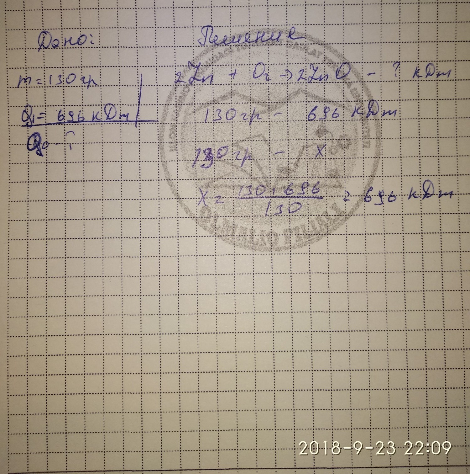 100 БАЛЛОВ!Срочно!Составьте термохимическое уравнение если при сжигании 130 г цинка выделилось 696 кДж